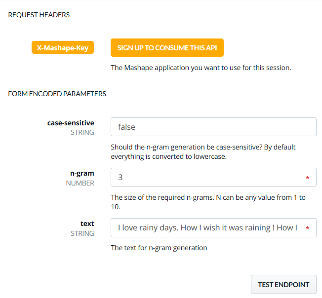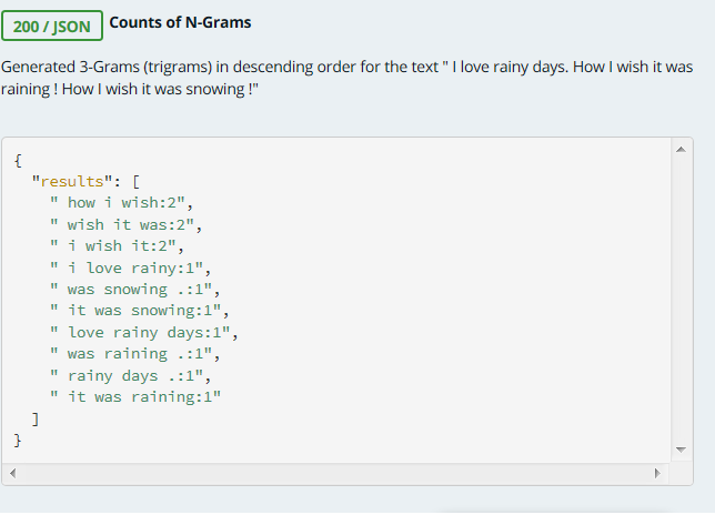 Here is an example of NGramCounter parameters in Mashape for generating tri-grams for the text “I love rainy days. How I wish it was raining ! How I wish it was snowing !”